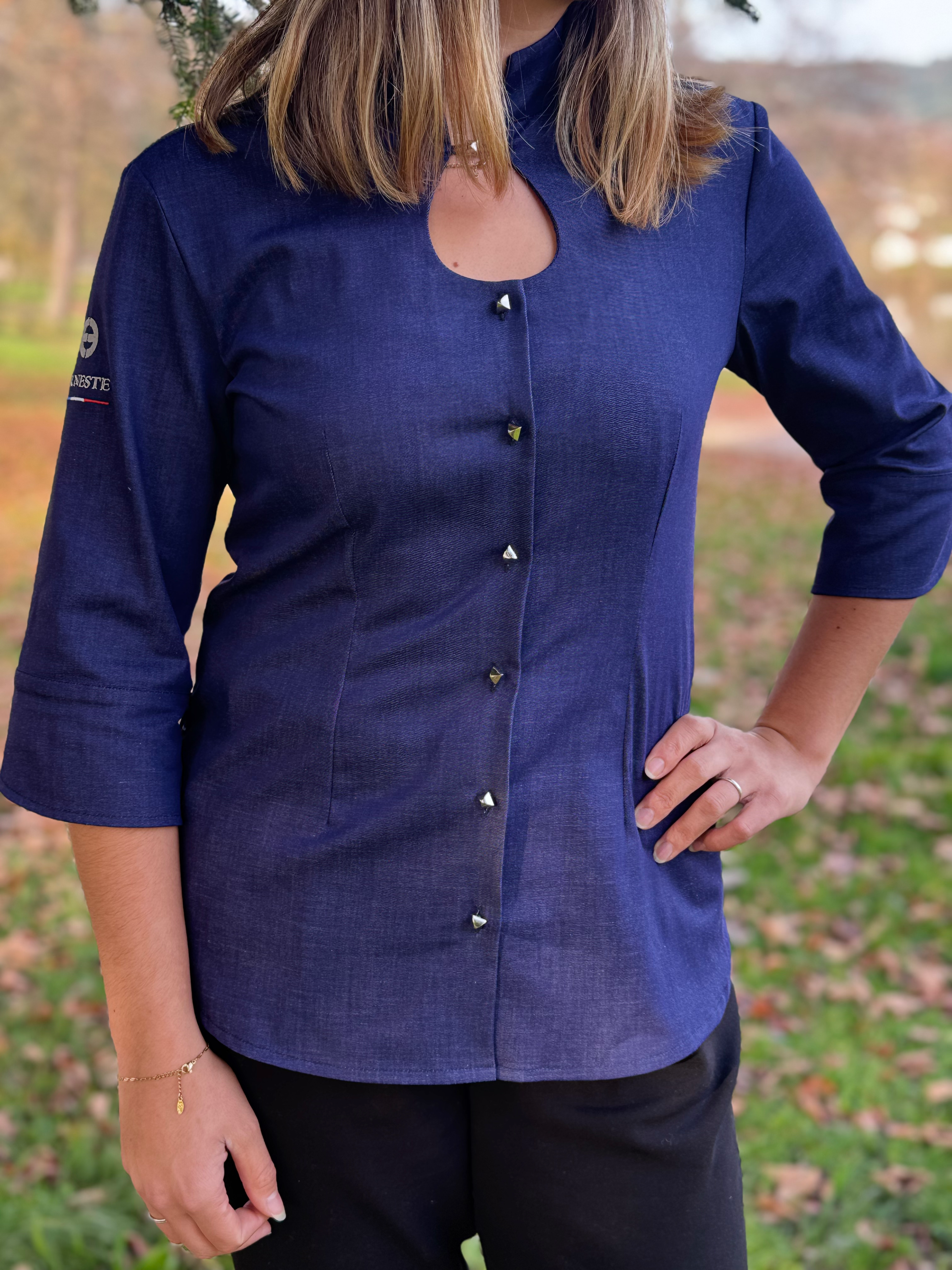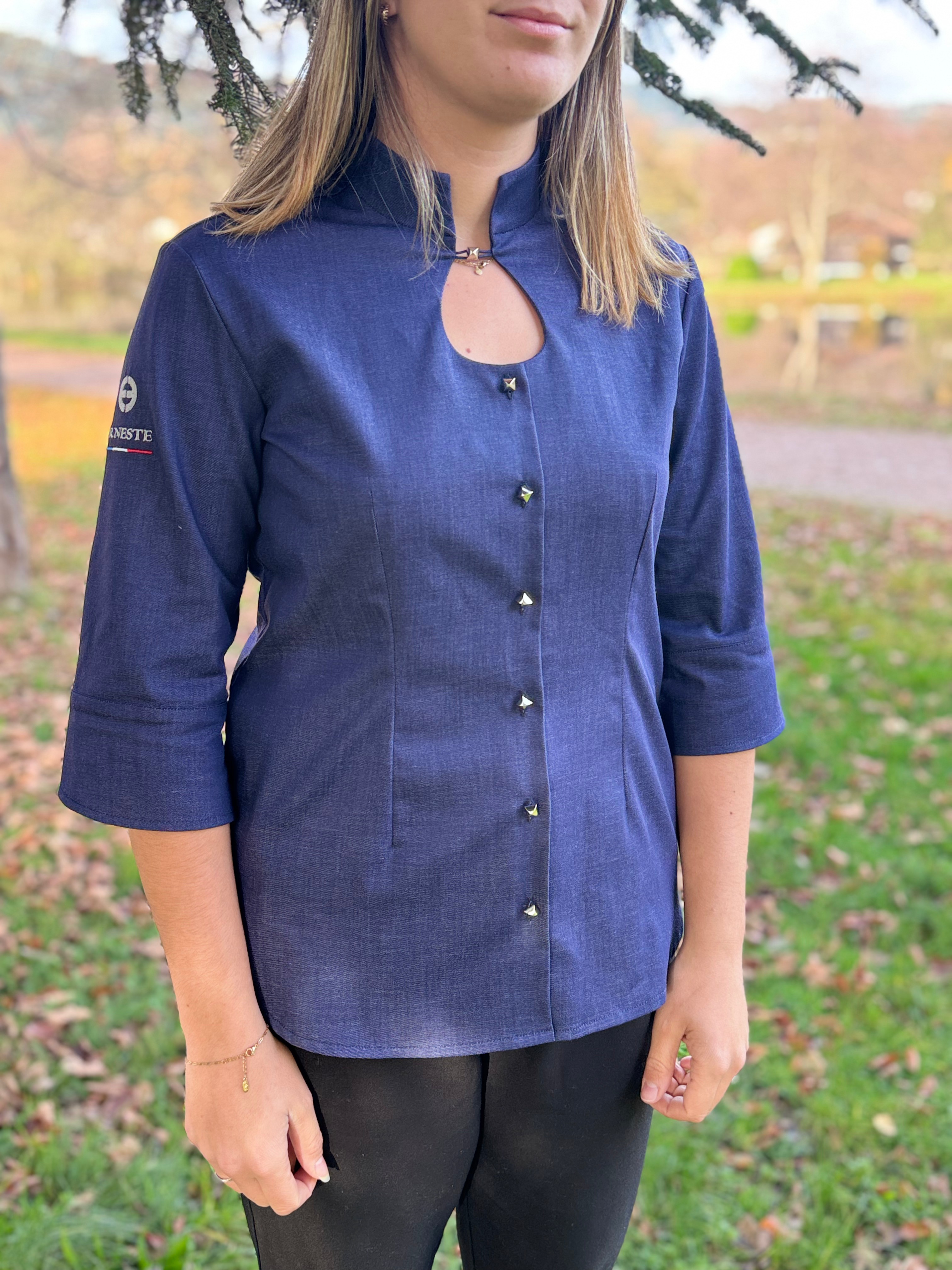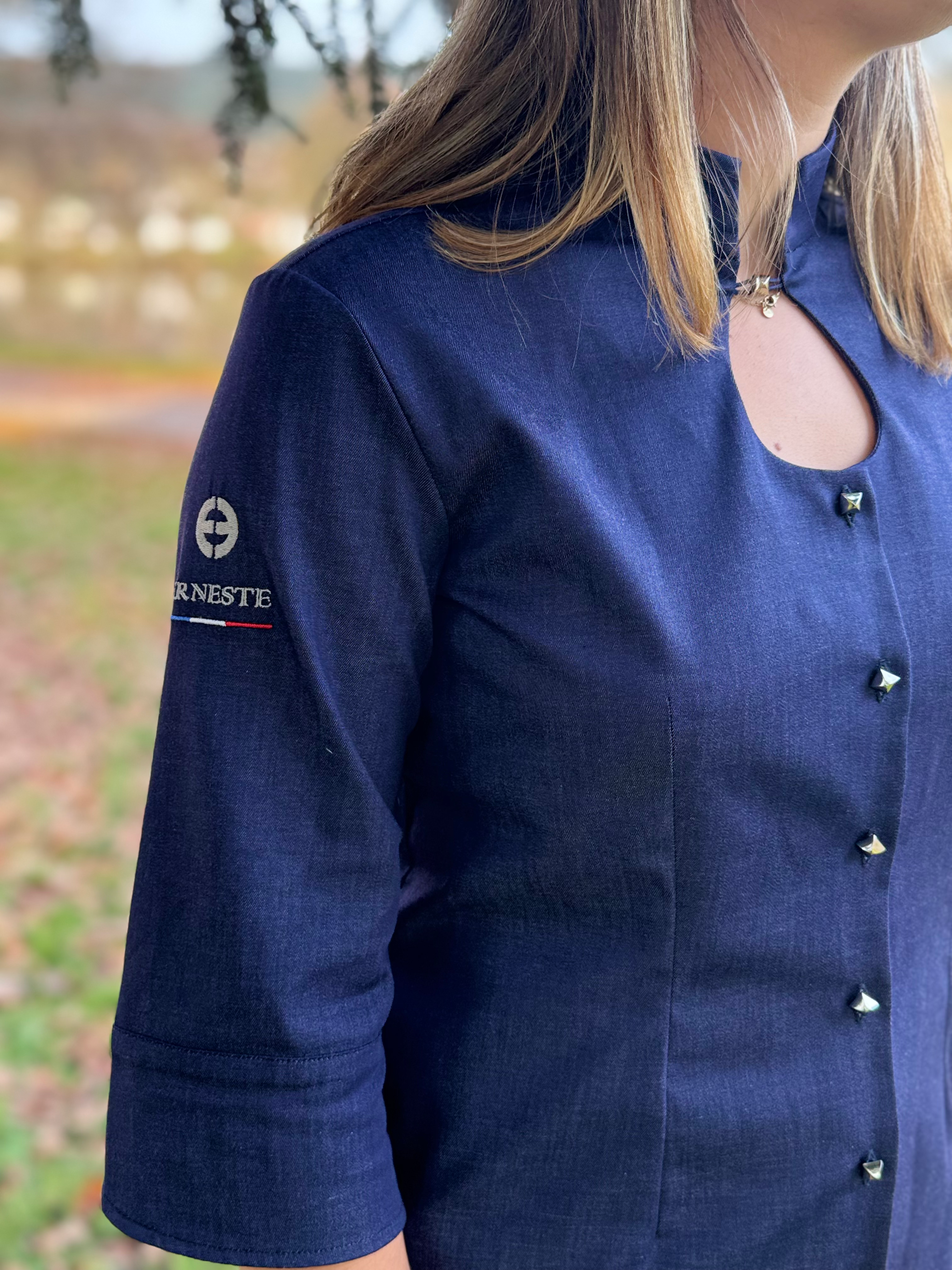Présentation : Uni, manches coudes revers arrondis, col goutte, pinces à la poitrine