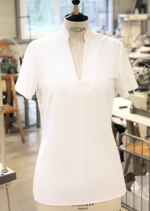 Présentation : Uni, sans fantaisie, col officier, pinces à la poitrine, encolure en V légèrement arrondie